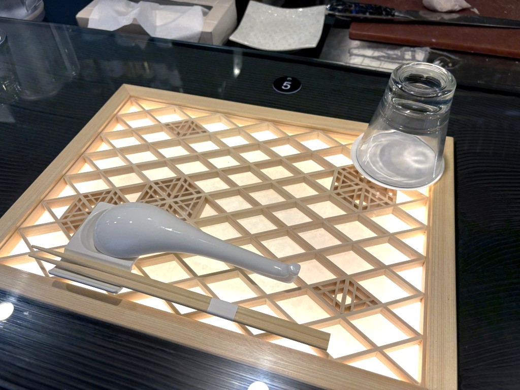 店内もシックでおしゃれに仕上がっていますが、特筆すべきはどんぶりを置くスペースに、客席一つ一つ違うデザインの木彫りの透かし細工が埋め込まれているカウンター。
